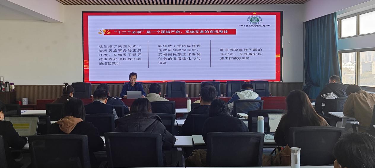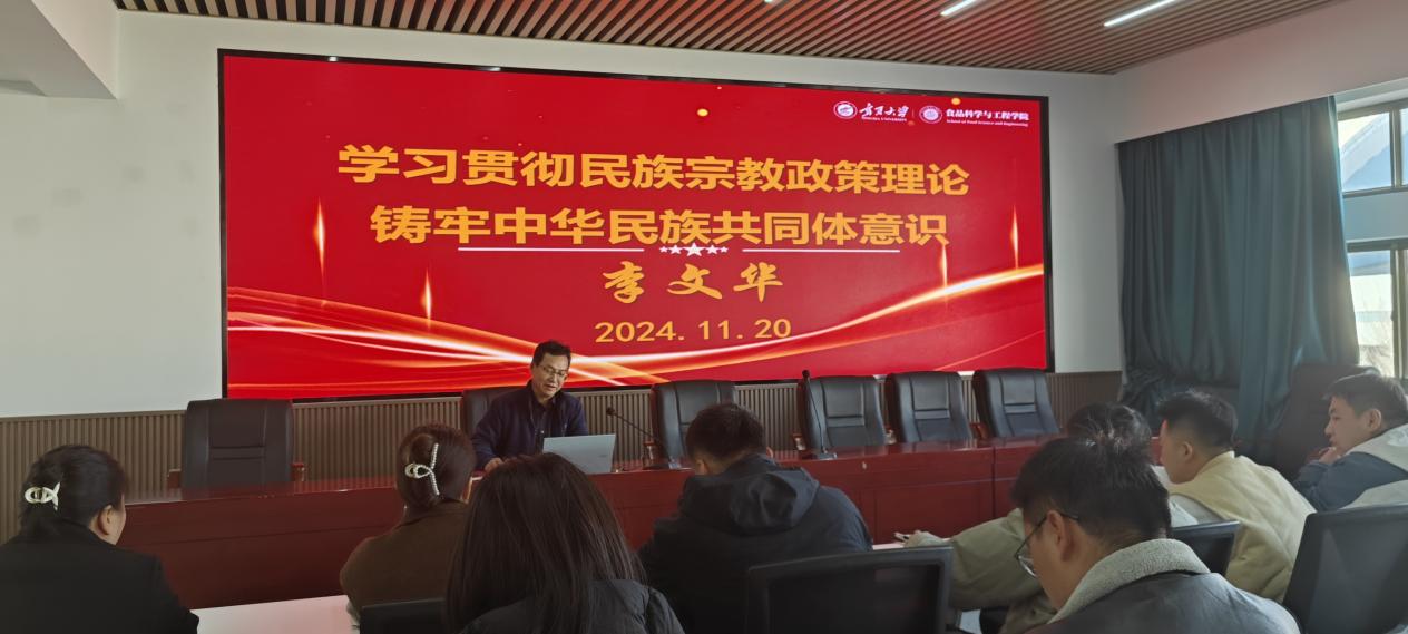 为深入学习贯彻习近平总书记关于加强和改进民族工作的重要思想,铸牢中华民族共同体意识,推进新时代党的民族工作高质量发展,11月 20 日,食品科学与工程学院组织开展了民族宗教政策理论专题宣讲活动。本次活动由学院党总支副书记李文华进行宣讲,学院全体教职工参加了此次活动。