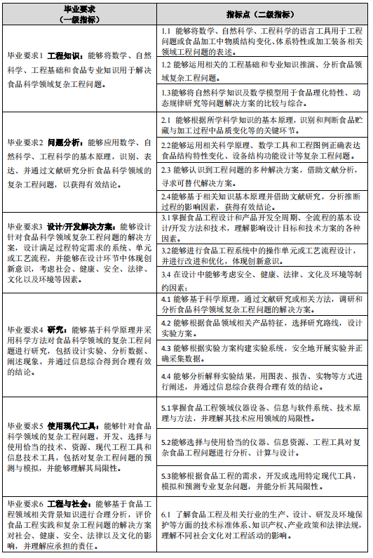 专业立足西部、面向全国,以培养德智体美劳全面发展的社会主义的合格建设者和可靠接班人为己任,秉承“不怕困难,不畏风寒;根深叶茂,本固枝荣”的“沙枣树精神”,培养具有艰苦创业、负重拼搏、勇于创新、开拓进取特质,能够在食品科学与工程领域,尤其是在自治区特色食品资源加工与利用方向从事食品加工生产、品质控制、工程设计、产品研发、经营管理等工作的创新型应用人才。预期学生毕业 5 年左右能达到: