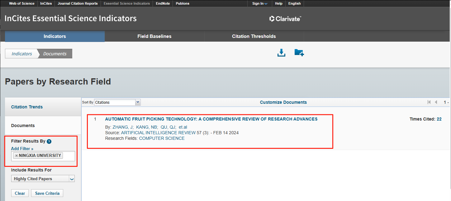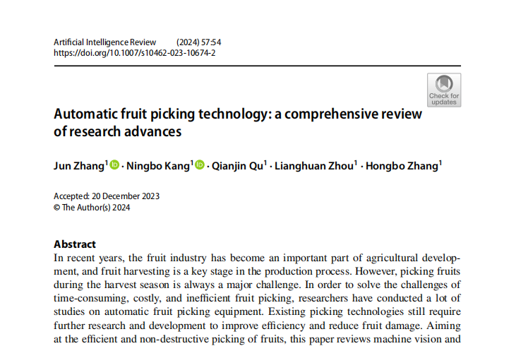 近日,食品科学与工程学院2024届硕士研究生张军(第一作者),指导教师康宁波(通讯作者)在计算机科学-人工智能领域顶级期刊《Artificial Intelligence Review》(JCR Q1,IF=13.9)发表的第一作者单位为英国威廉集团官网的论文“Automatic fruit picking technology: acomprehensive reviewofresearch advances”被遴选为ESI数据库高被引论文,其被引频次已进入计算机科学领域最优秀的1%之列。