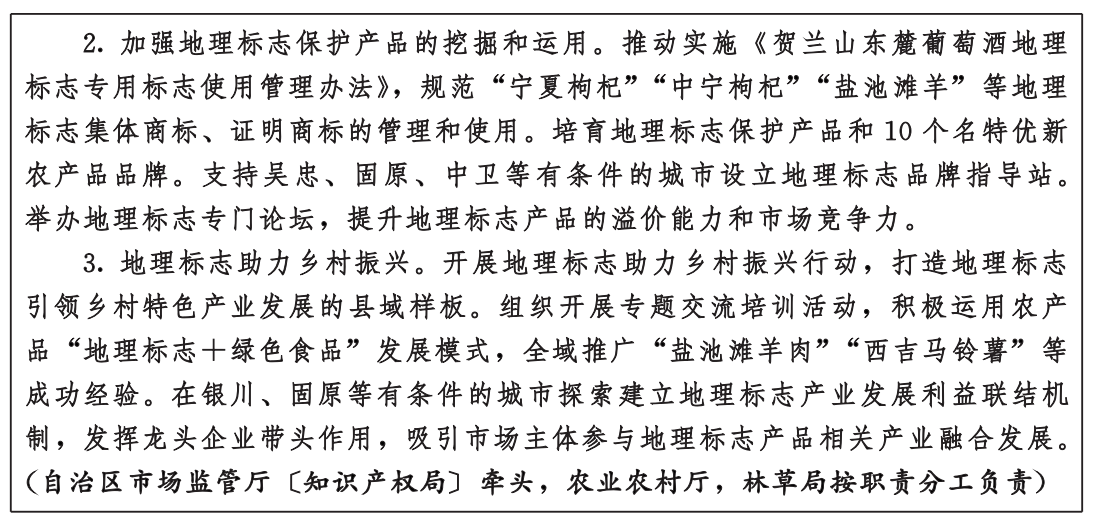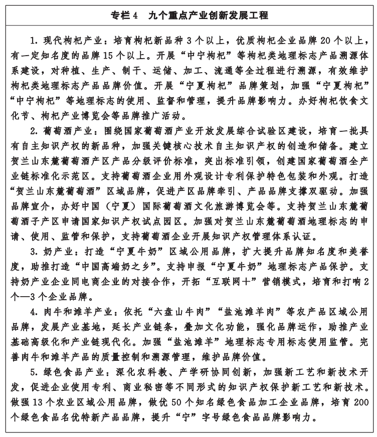 3.建设一批高价值的优质品牌。建立健全品牌推进工作体系,引导企业树立和提高品牌意识,加强质量管理、品牌资产管理和名品名牌文化建设。加快实施区域品牌培育工程,推动设立商标品牌创新创业基地,在现代农业、先进制造业、文化旅游业等领域培育一批具有市场竞争力、国际影响力的知名商标品牌。强化商标品牌培育帮扶指导,支持商标品牌指导站建设。加强对“贺兰山东麓葡萄酒”“宁夏枸杞” “盐池滩羊”等重点地理标志产品的宣传力度,打响地理标志知名品牌。探索建立黄河几字湾跨区域农业产业化联合体,培育“宁夏牛奶” “六盘山牛肉”等农产品区域公用品牌。扩大“大漠星空” “塞上江南”等宁夏区域公共品牌的影响力。(自治区党委宣传部〔版权局〕,发展改革委、工业和信息化厅、农业农村厅、商务厅、文化和旅游厅、市场监管厅〔知识产权局〕,广电局,林草局按职责分工负责)
