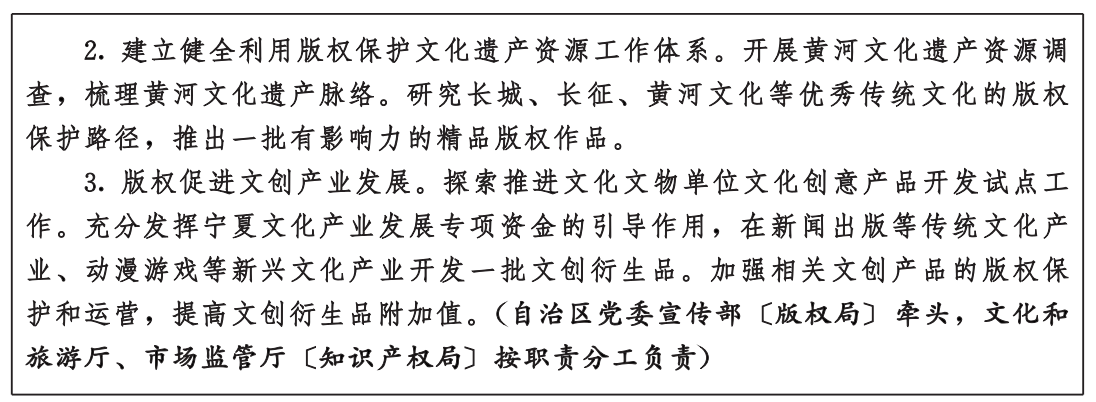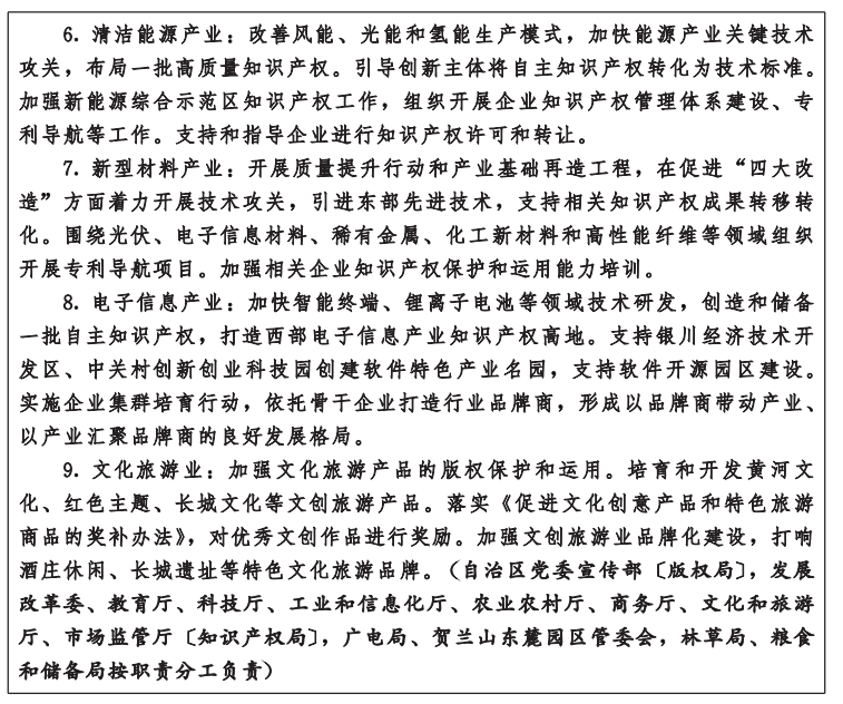 1.完善知识产权法规政策。依法及时推动知识产权地方性法规、规章的立改废释。探索制定电子商务、大数据和人工智能等新领域、新业态的知识产权保护规则,加强数据生产、流通、利用、共享过程中的知识产权保护。制定实施现代煤化工、新能源、新型材料、装备制造等优势特色产业的专利、商标、商号的保护政策,建立健全民间文学艺术作品、非物质文化遗产和中医药等领域的知识产权保护措施。研究制定规制知识产权滥用行为的有关工作规范。落实商业秘密保护规定。支持吴忠、固原出台地理标志保护和运用制度。依法加强涉及国家安全的知识产权对外转让行为管理。(自治区党委宣传部〔版权局〕、网信办,发展改革委、司法厅、生态环境厅、农业农村厅、商务厅、文化和旅游厅、卫生健康委、市场监管厅〔知识产权局〕,高级人民法院、人民检察院,银川海关,林草局、药监局按职责分工负责)
