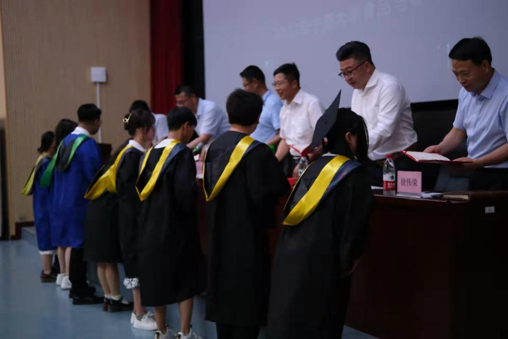 在温馨的音乐下,毕业典礼拉开序幕。本科毕业生代表牛玉平、硕士毕业生代表周婷依次发言。春萌青草,夏沐芳华,秋染落叶,冬凝雪花,他们回忆了求学中的点点滴滴,懵懂的少年在时光的磨炼、师长的指导、同窗的陪伴与鼓励成长为可以为祖国建设的优秀青年。感恩宁大、感恩食葡、感恩恩师、感恩同窗,他们表示会在今后道路上铭记“尚德、勤学、求实、创新”的校训、传承发扬“沙枣树精神”、牢记学院的嘱托、带着大家的祝福以青春之我,创理想未来。再见时,愿君明媚如初、灿烂如初。