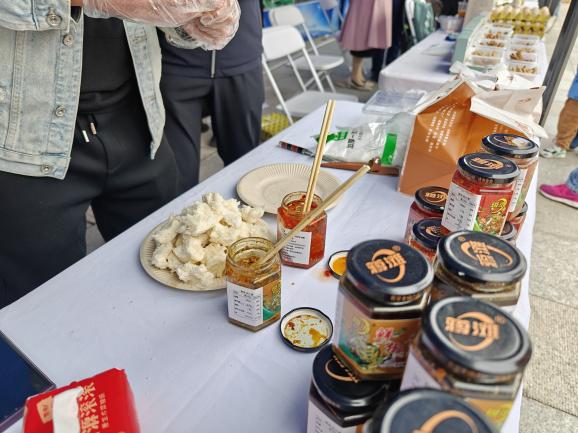 刘敦华教授带领的辣椒科技小院精心呈上了红椒酱和绿椒酱,并搭配大馒头供观众品鉴。产品独特风味瞬间征服众人味蕾,生动诠释了科技为传统农业注入的强大活力与无限潜力。刘敦华教授向领导详细阐述辣椒产业的技术创新成果,着重强调了产品增值和市场拓展的重要性。