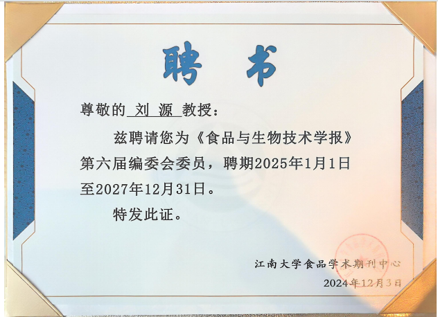 近日,我院院长刘源教授被聘为《食品与生物技术学报》第六届编委会委员,聘期2025年1月1日至2027年12月31日。