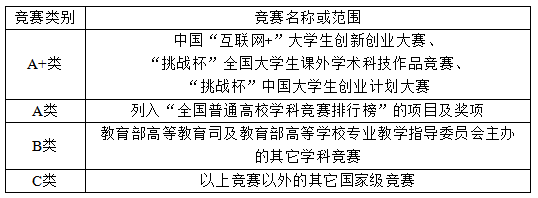 经特殊学术专长专家审核工作小组考核通过的科研竞赛奖励,依照2021年3月22日中国高等教育学会高校竞赛评估与管理体系研究工作组发布的全国普通高校大学生竞赛排行榜(详见附件二),根据学科竞赛的组织机构、社会影响和获奖难度等方面综合考虑,将省级以上学科竞赛的类别分为A+、A、B、C四类。竞赛评级按特殊学术专长专家审核工作小组认定为准。竞赛分类标准如下: